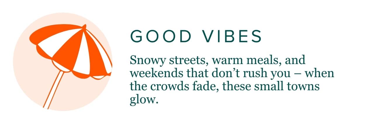 From mountain towns wrapped in fresh powder to storybook villages with antique shops and farm-to-table meals, these destinations invite a gentler kind of escape. It’s less about checking boxes and more about warm meals, quiet mornings, and letting winter be exactly what it is.